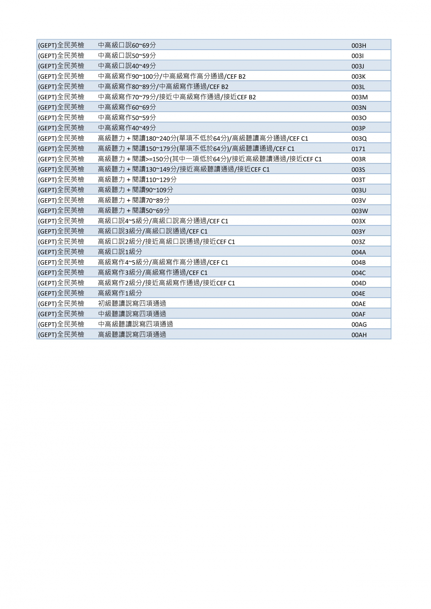高中生學習歷程證照代碼查詢 如何登錄GEPT證照代碼? 國內 > 語言證照-英文 > (LTTC)The Language Training &Testing Center[財團法人語言訓練測驗中心] > (GEPT)全民英檢 尚未達到GEPT聽讀/口說/寫作通過標準,可以登錄嗎? 可以!各個成績區段都可以登錄,詳見下表。 GEPT學習歷程代碼總表。