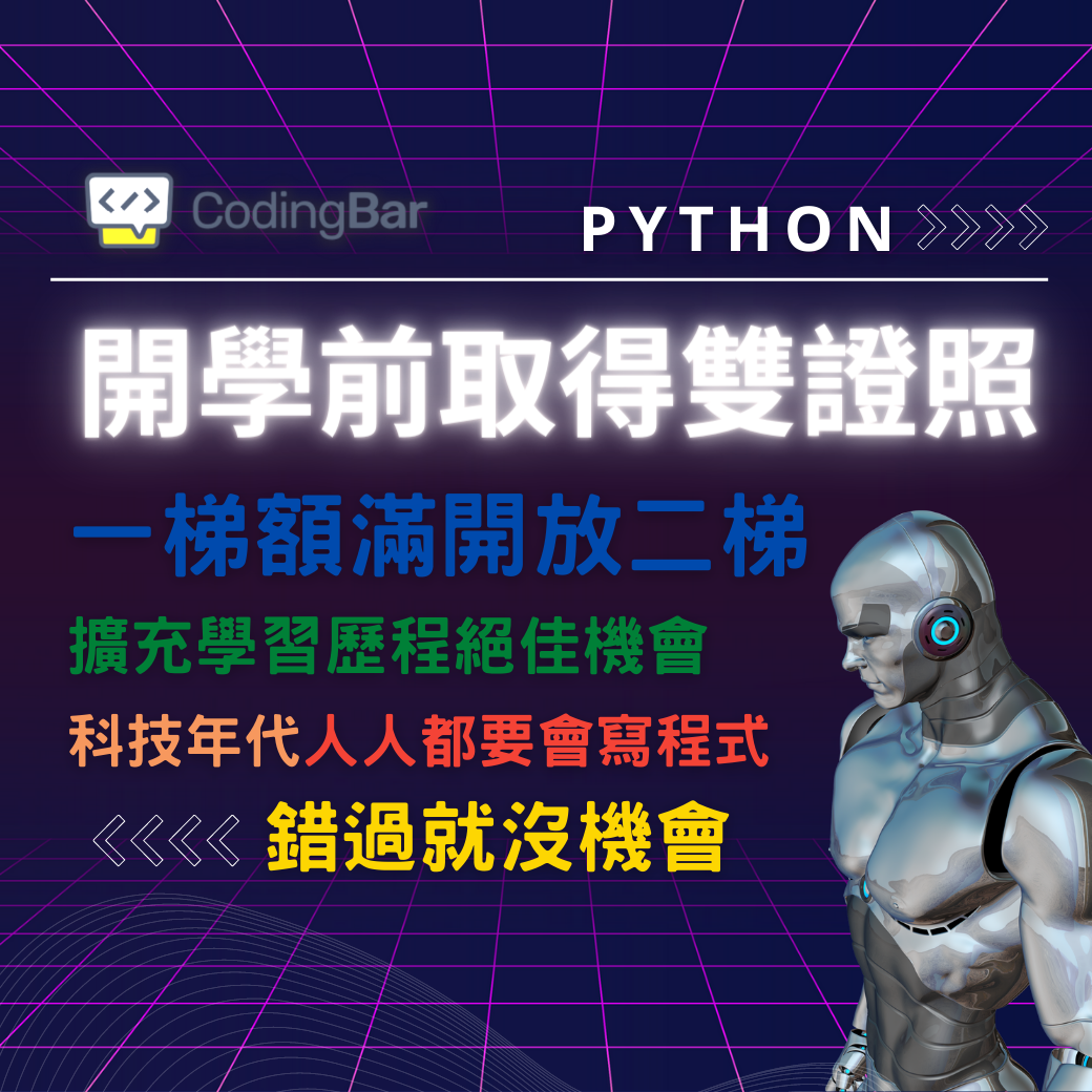 [python程式體驗課 ] 108課綱學習歷程納入國際證照加分項目, 證照屬個人加分能力升學、就業都很好用 想了解更多嗎?! 基隆儒林邀請您加入暑假PHTHON程式考照班, 有興趣的家長同學可以來預約了解課程!! 基隆儒林和CodingBar策略合作創造100%合格考照率, 並協助學生成功擴充學習歷程! 小班教學,品質保證! #利用暑假獲取雙證照 #擴充學習歷程與自主學習的好機會 #零基礎也能順利取得證照 #四梯次100%通過率 #CodingBar基隆唯一授權學校 #基隆儒林辦學最用心